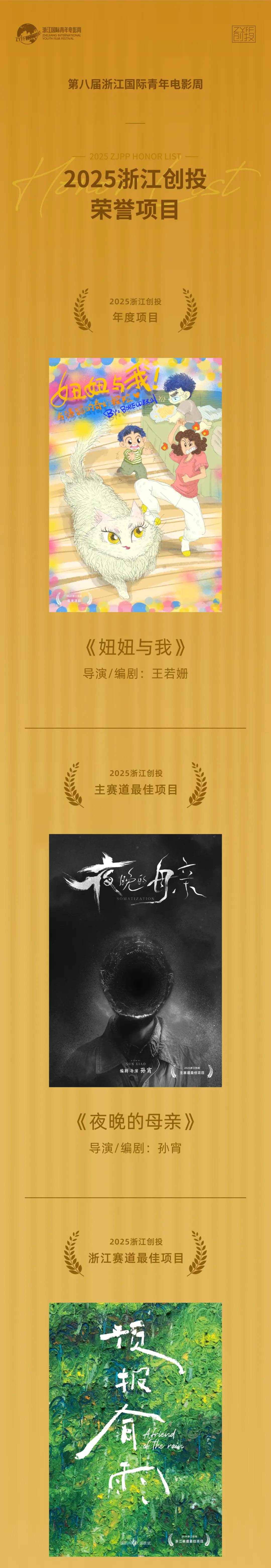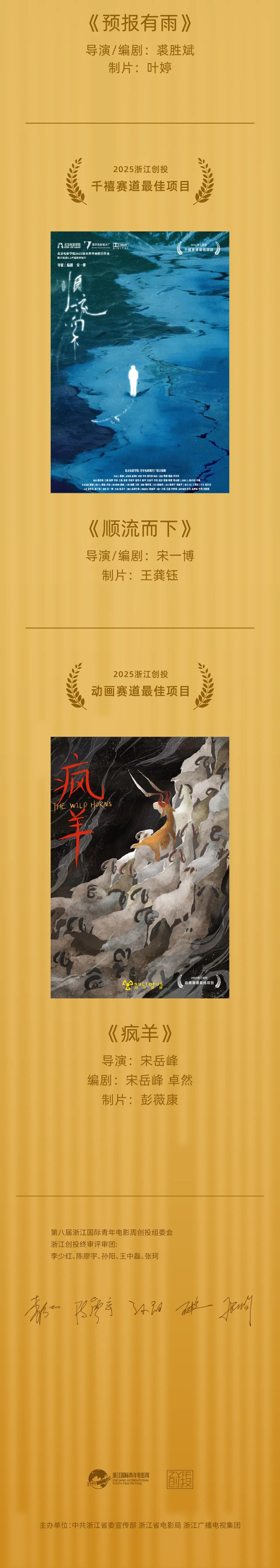 此外,《夜晚的母亲》获得主赛道最佳项目荣誉,《预报有雨》获得浙江赛道最佳项目荣誉,《顺流而下》获得千禧赛道最佳项目荣誉,《疯羊》获得动画赛道最佳项目荣誉。